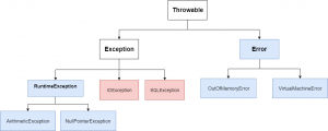 The boxes in blue represent unchecked exceptions, while the ones in pink represent the checked exceptions.