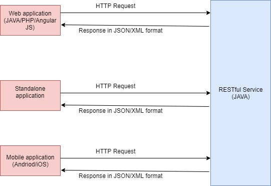A RESTFul service is also independent of technology. So a REST service can be implemented in Java/Node.js/PHP or some other technology. So also, the REST client can be implemented in any technology. It can be a web application implemented via JSP/Servlets or Angular JS or it can be a mobile application implemented via Andriod or iOS.