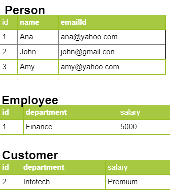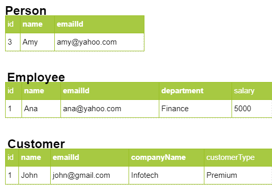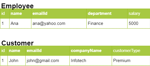 The Employee table has fields corresponding to name, emailId, department and salary. The Customer table will have fields corresponding to name, emailId, companyName and customerType.