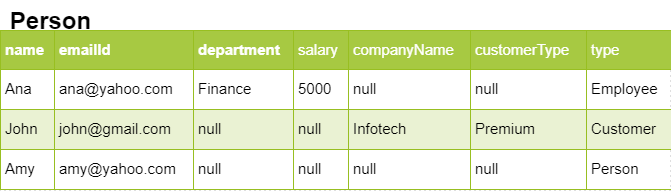Each record uses only a subset of the columns corresponding to the underlying entity that it represents and sets a null value for the other columns. So an Employee record will only use the columns name, emailId, department, salary. It will have null values for customerType and companyName fields_._