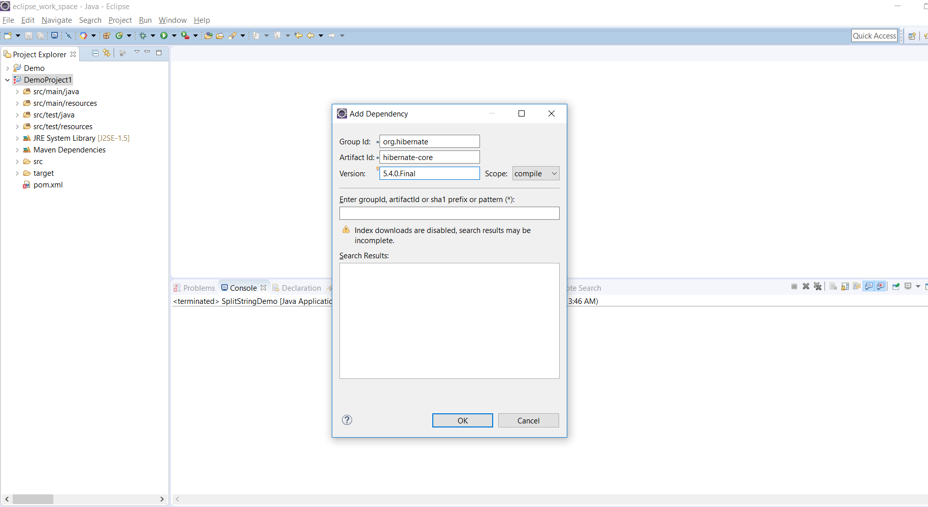 Step 3 - Enter group id, artifact id and version for the Dependency that you wish to add. Suppose, you need to add the dependency for hibernate. You can enter the following: