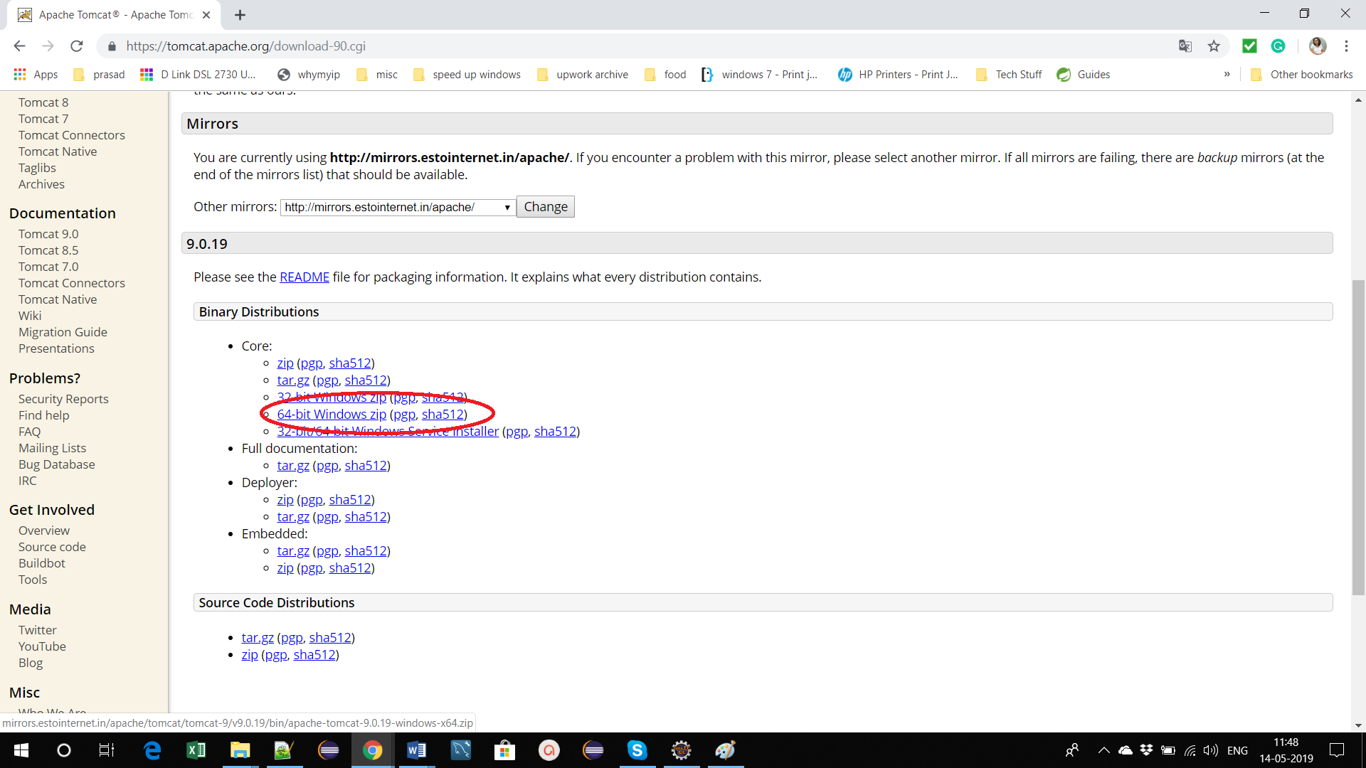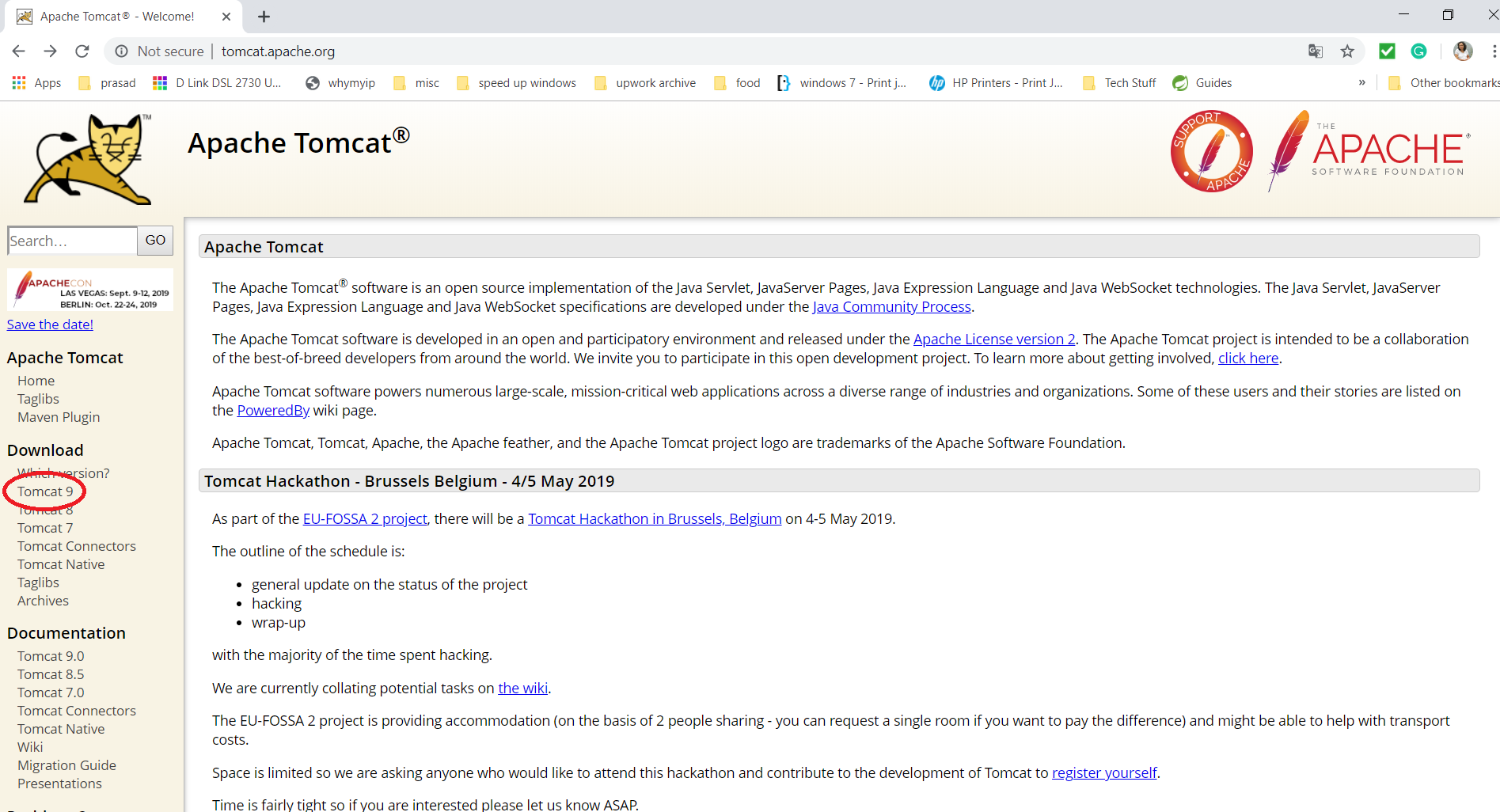 Go to the Tomcat site - http://tomcat.apache.org/. Click on Tomcat 9 in the left pane as shown below: