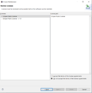 Accept the license agreement and click on Finish. This will prompt you to restart Eclipse.