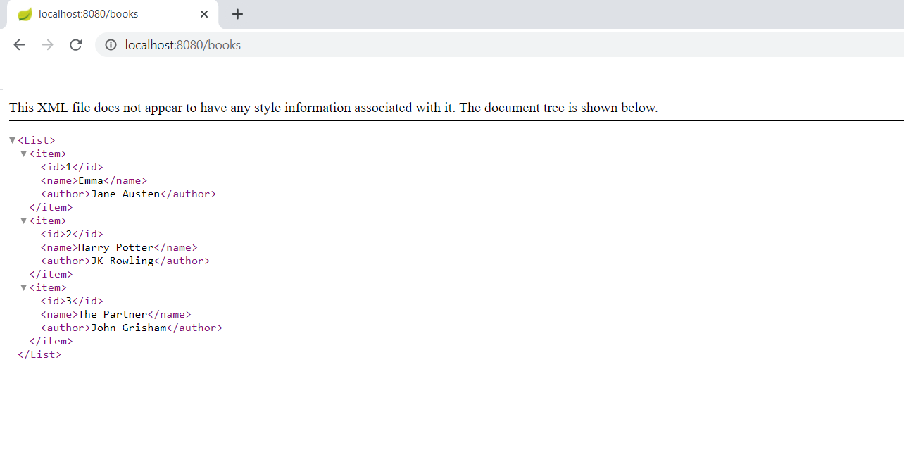 Step 7 - Open a browser window. Type http://localhost:8080/books/ . This displays the following XML output: