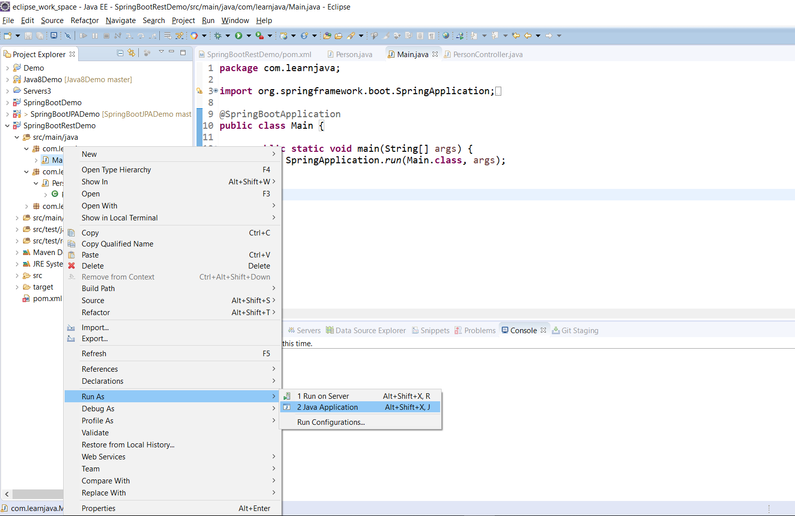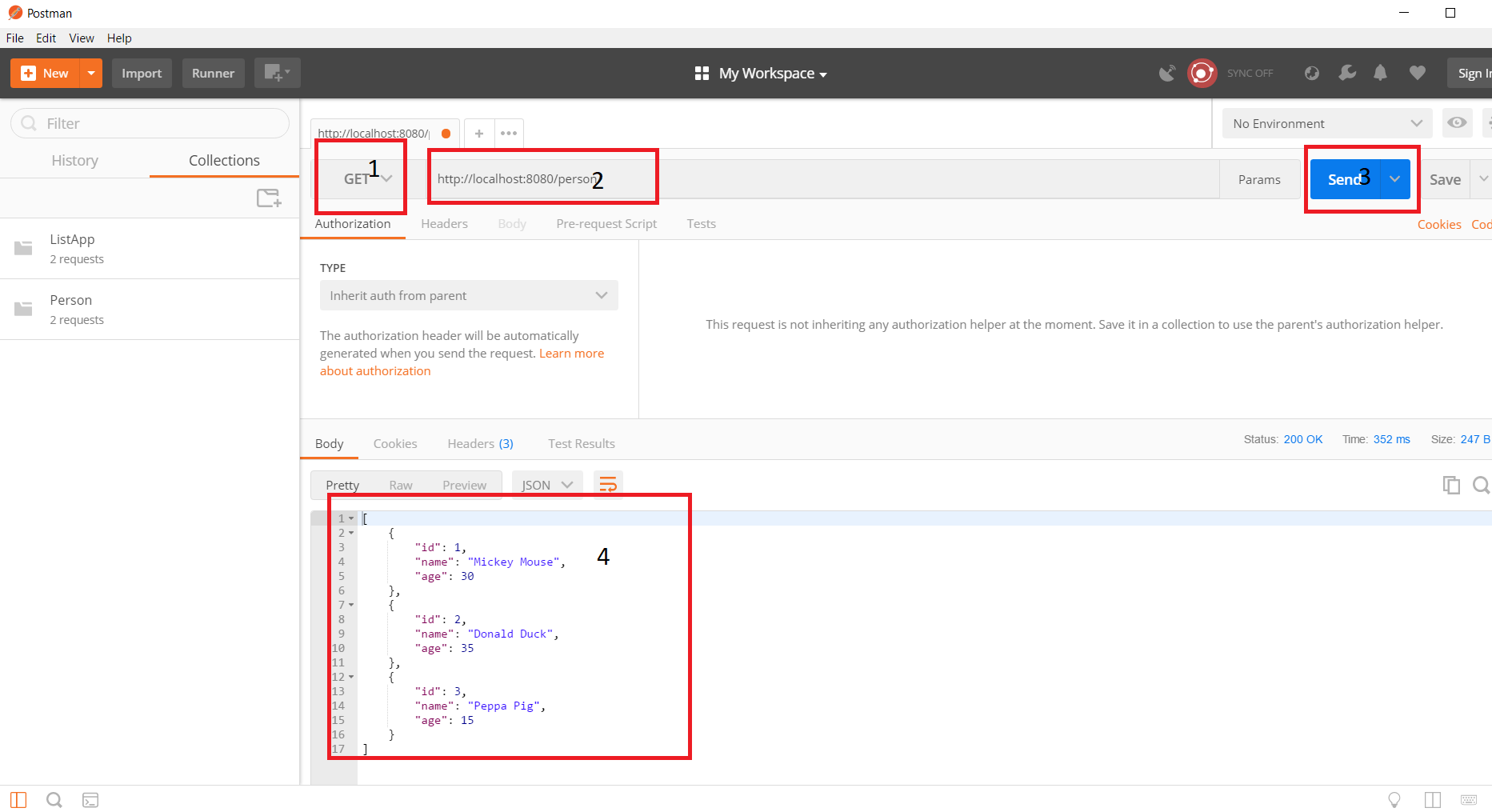 This annotation specifies the URL that this method maps to and also specifies that it is an HTTP GET Request. It is a composite annotation that acts as a shortcut for @RequestMapping(method = RequestMethod.GET). This is specified for the getAllPersons and getPersonWithId methods.