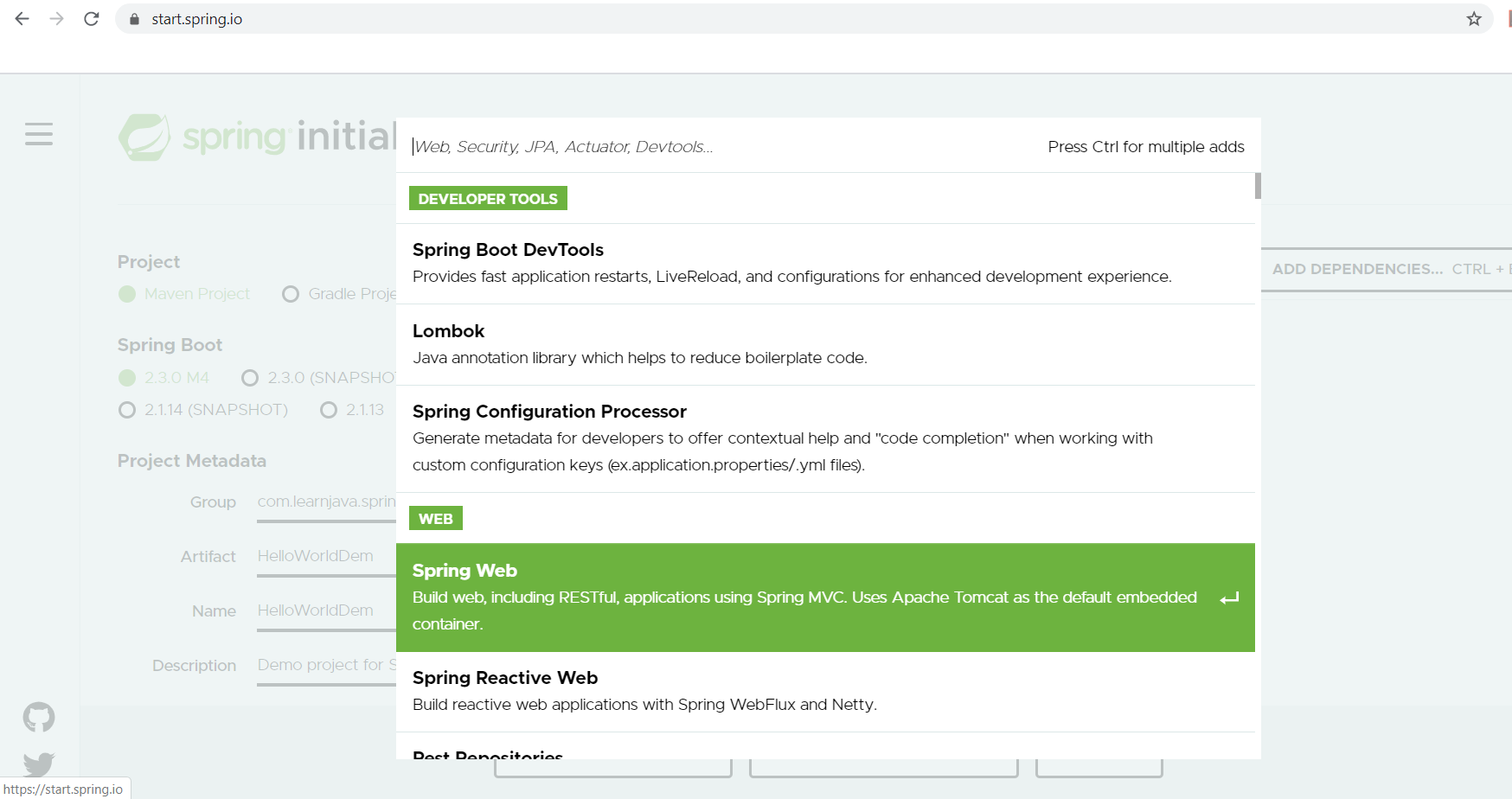 Step 4c - Once you click on the dependency, it will show the following screen. So here, I’ve selected the “Spring-web” dependency: