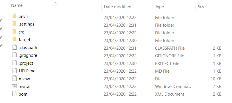 Step 2 - Import this as a Maven project in your IDE. I am using Eclipse. So this creates an Eclipse project as follows. The pom file has some default dependencies as well as the additionally selected dependencies: