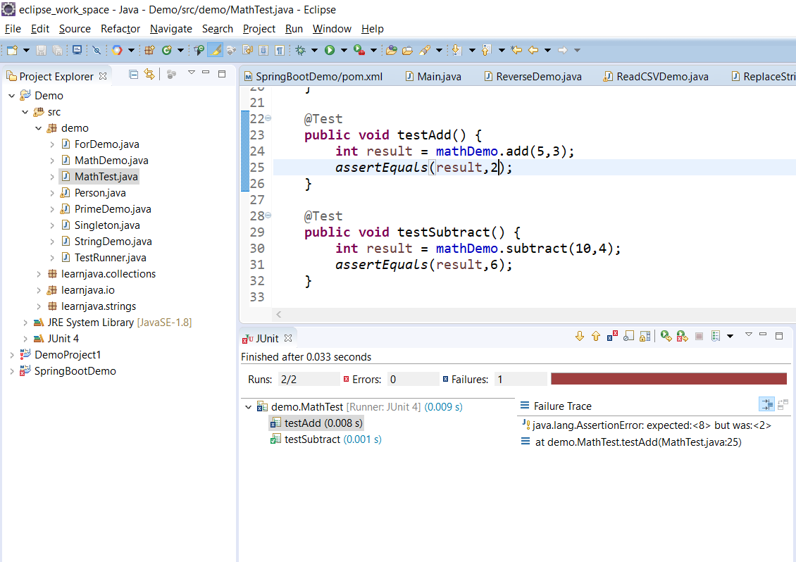 testAdd(demo.MathTest): expected:<8> but was:<3>