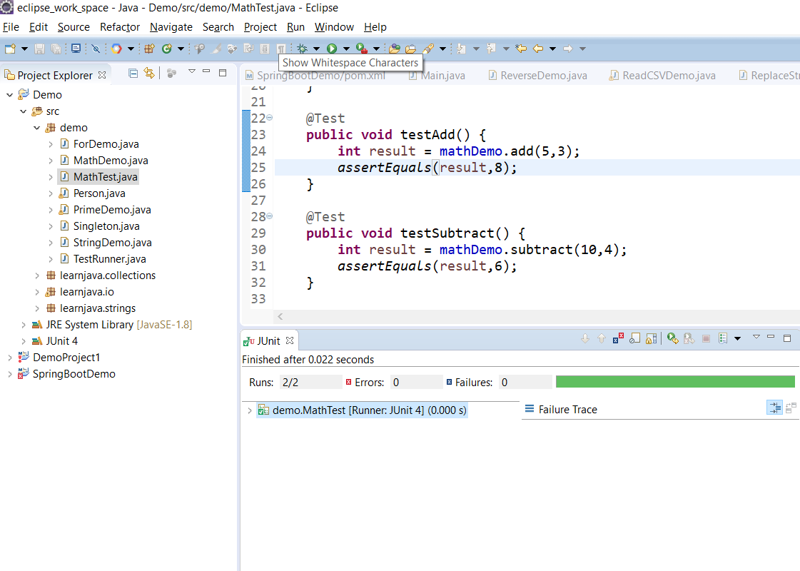 testSubtract - This method tests the subtract method in the MathDemo class. As in the case of the testAdd method, it invokes the subtract method using two numbers and uses the assertEquals method to check if the actual result is the same as the expected result.